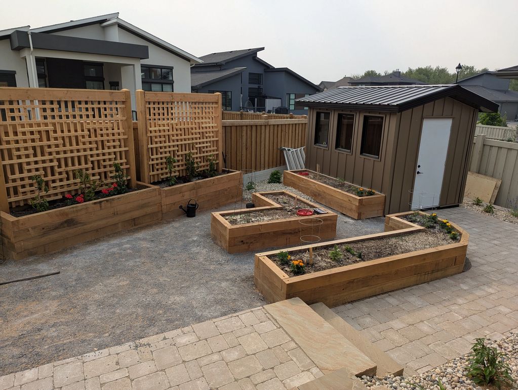 This customer wanted some unique garden boxes and a shed. 4x6 Douglas Fir was used for the boxes and a metal board and batten siding was installed on the shed.